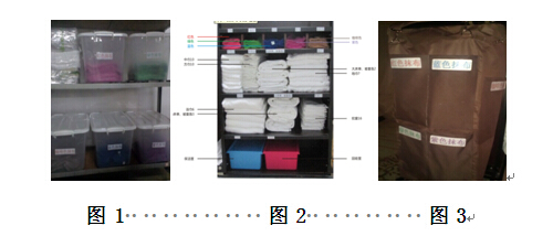 专属空间,让抹布放置更安心。洗衣房里的专用储存箱,让抹布同一颜色统一归置(见图1),针对分色管理特别改良的、拥有抹布指定放置位置(见图2)的楼层工作车也安排了专用“停车位”,就连被使用过的脏抹布也有专门的安置点——按照颜色分类指定的布草袋内(见图3)。