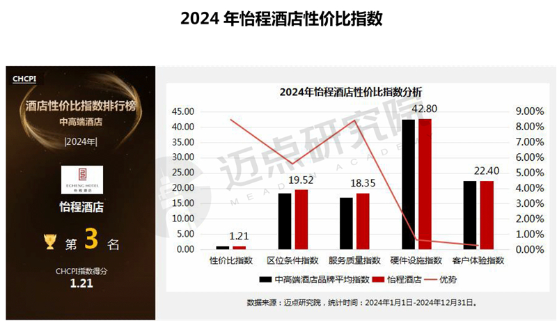 中高端酒店品牌案例分析:怡程酒店位列2024年中高端酒店性价比指数榜单第三。怡程酒店是东呈集团旗下中高端商务酒店品牌,位列2024年中高端酒店品牌性价比指数榜单第三名。服务质量是其突出优势之一。在前台接待、餐饮、客房服务等环节,怡程酒店服务人员的态度、响应速度及服务专业性表现卓越,能为住客提供优质、贴心的服务体验。