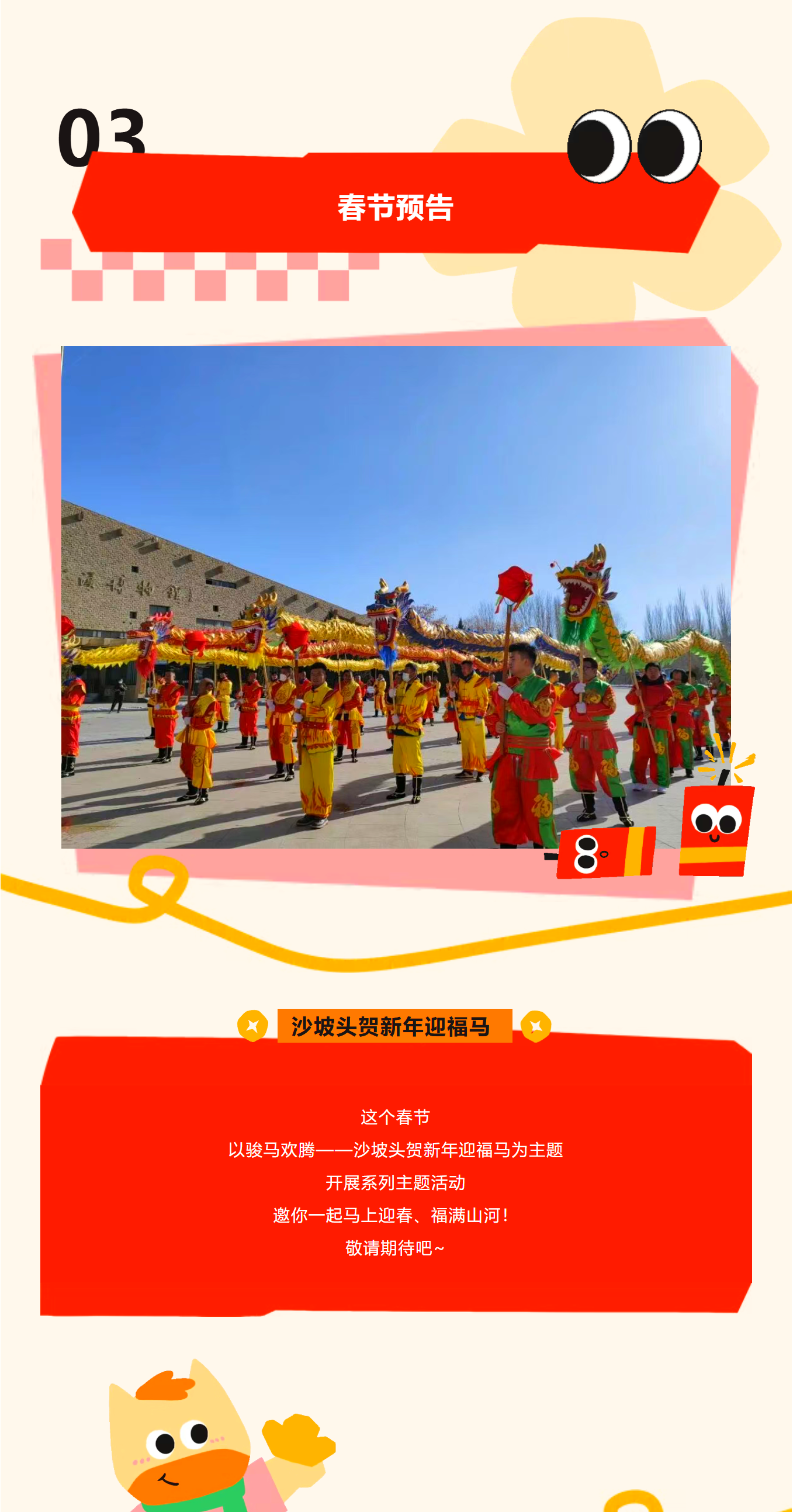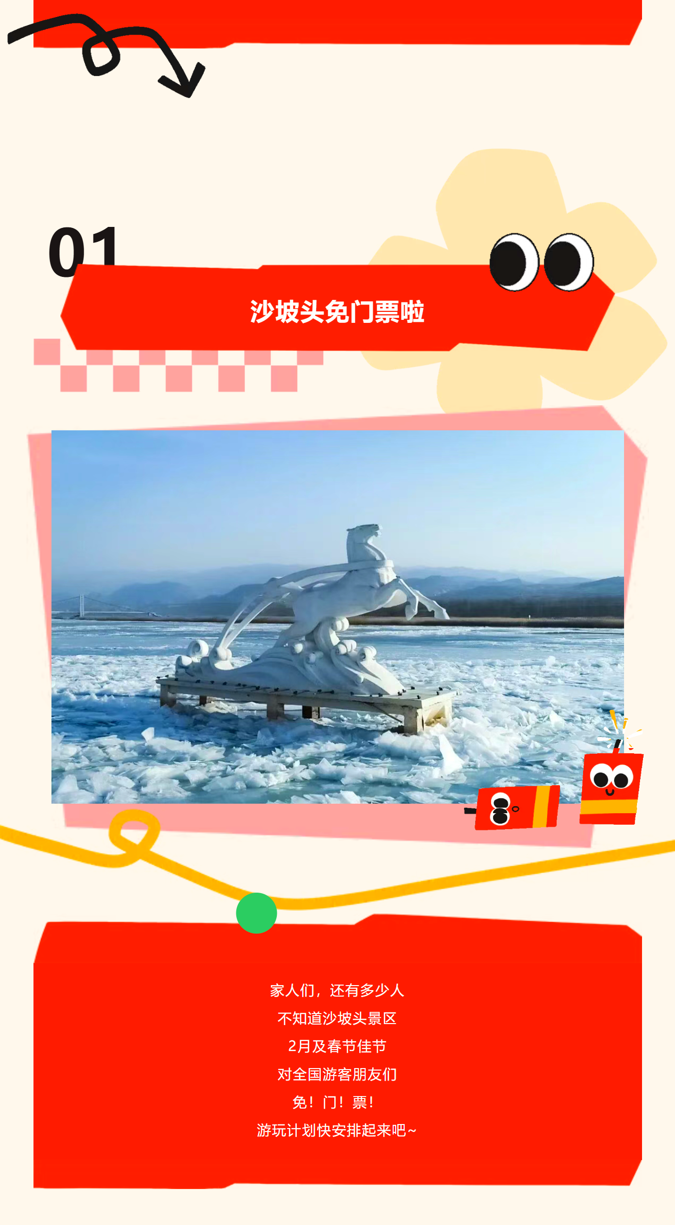 春节沙坡头免门票,“马上”出发! 沙坡头景区 · 2026-02-11 09:04:49 分享到 打开微信“扫一扫”,打开网页后点击屏幕右上角分享按钮。 1月日历已翻篇 马年将至 新一年就要从叠满的新春福利开始 快来解锁马年好运 马上加薪,马上有钱,马上出发! 来源|沙坡头景区 沙坡头景区 0