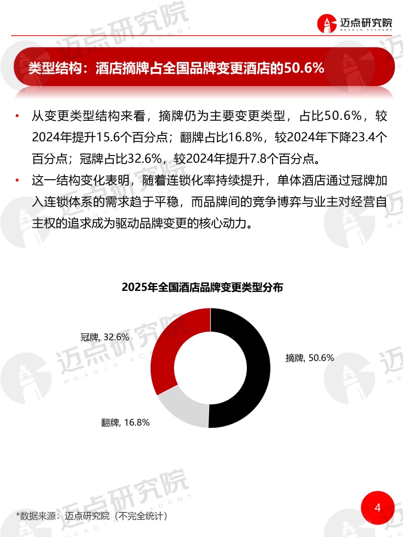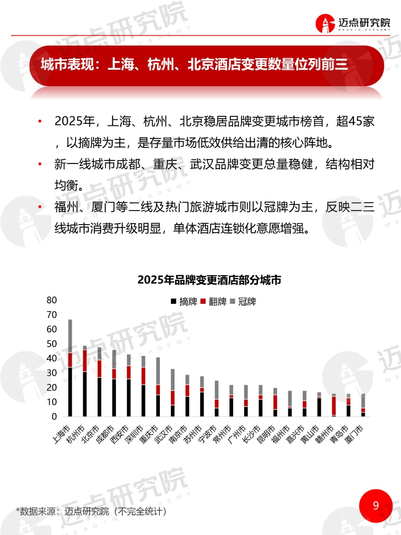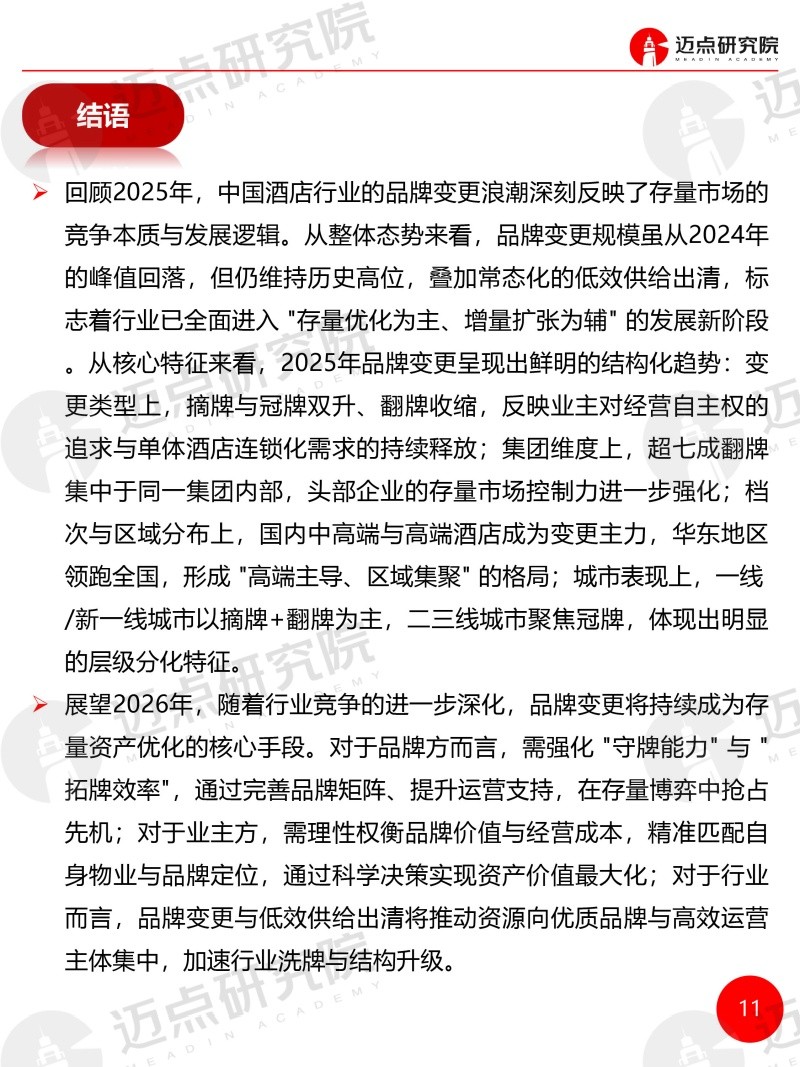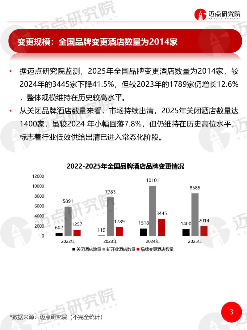 2025年度全国酒店品牌变更统计报告 迈点研究院 · 刘倩 · 2026-03-25 09:03:41 分享到 打开微信“扫一扫”,打开网页后点击屏幕右上角分享按钮。 据迈点研究院监测,2025年全国共有2014 家品牌酒店发生品牌变更,覆盖257个地级市,涉及客房规模近18.21万间。 品牌 酒店 酒店报告 0