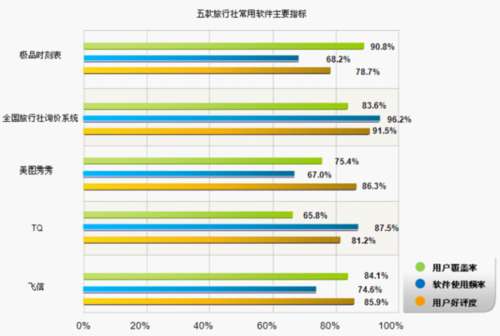 根据对旅行社从业人员的调查发现,共有极品时刻表、全国旅行社询价系统、美图秀秀等5款软件,在各项数据指标均居于各应用软件前列,成为在旅行社用户群中,具有一定影响力,并且增长速度最快、成长力较强的行业软件。