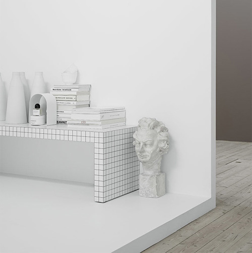 又如这个纯白色的卧室场景,明显单品则是 Plateau 储存支架,以及为 Örsjö Belysning 品牌设计的 Vinge 台灯。