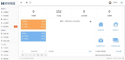 功能特色:房源筛选,批量导入;对接智能硬件,开放API可对接智能门锁、智能电表、支付宝及银行系统等;统计分析,应收应付按时间维度和房客维度展示,实现公寓管理智能化;财务管理,实时备份,智能收租。