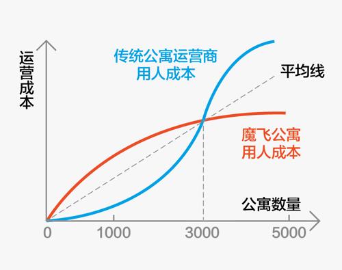 下图为魔飞公寓经过财务科学测算分析,当房源数量小于3000间,运营成本高于传统公寓企业;当房源量等于3000间,盈亏平衡;随着房源数量规模逐渐扩大,运营成本增速趋缓,运营效率远远高于传统公寓企业。