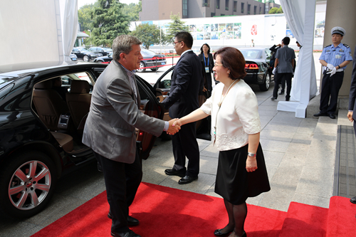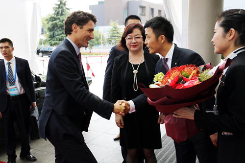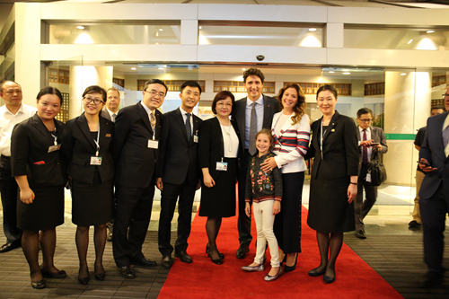 特鲁多总理一家得到饭店潘玮董事长、杨国荣总经理的热情迎接。
