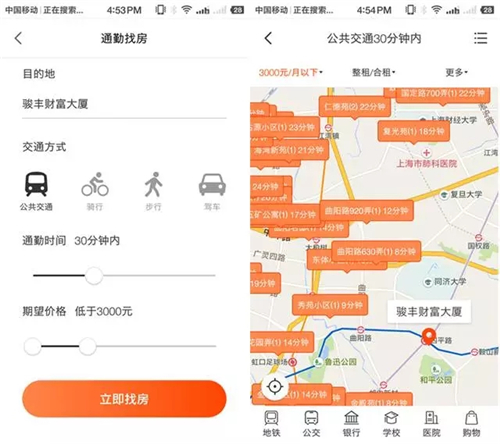 新增通勤找房功能,租房可以选择目的地、交通方式、期望的通勤时间及价格,APP即可自动匹配到符合条件的房源,并直观在地图上展现,大大提升了用户的找房效率。