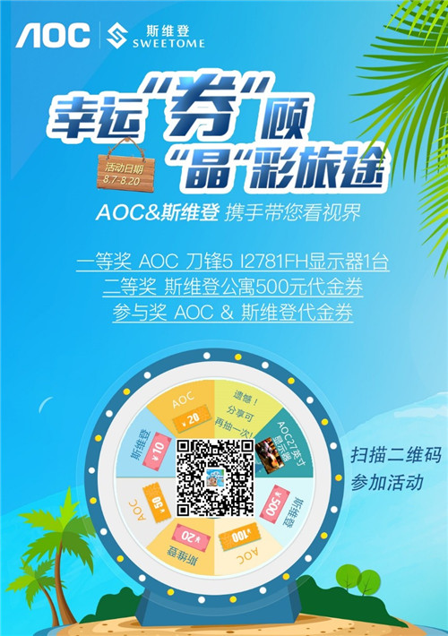 活动设置在2017年8月7日-8月20日期间,正值暑期的出游高峰期,活动在双方全国多个城市的上千家门店以及线上平台开展。活动不设门槛,扫码进入抽奖页面即可参与活动,赢取各种优惠及免单大奖!另外,在AOC线下门店以及天猫官方旗舰店购买AOC刀锋5、5S系列显示器以及炫锋系列显示器的用户,还可获得免费入住欢墅度假别墅、AOC显示器免单大奖、斯维登代金券等二重福利,只要参与就有惊喜!100%中奖!