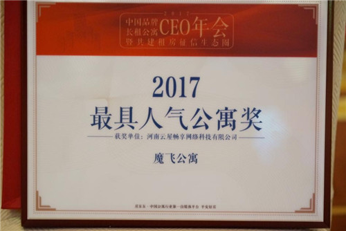 建业魔飞公寓斩获2017中国品牌公寓 “最具人气公寓奖”