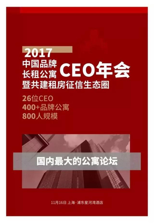 2017年11月16日,由房东东与平安好房联合主办的【2017年中国品牌长租公寓CEO年会】在上海举行。本次论坛云集了300多家公寓企业和社会机构,吸引了超过千名的公寓从业者。