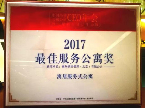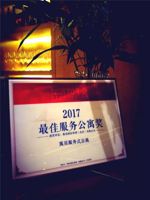 此次年会上为优秀公寓共设9个奖项。寓居服务公寓凭借优质的产品和服务,以“为居者而为”的理念赢得了良好的市场口碑,最终从众多公寓中脱颖而出,斩获2017年“最佳服务公寓奖”!