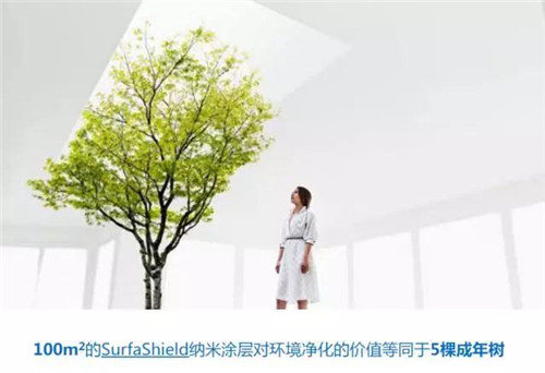 与传统的空调、新风系统、空气净化器等空气治理手段相比,莱恩创科采用更加高效、彻底、广泛、实用、安全的独家核心技术——纳米二氧化钛技术。莱恩创科研发生产的SurfaShield纳米自清洁系列产品由无机氧化物和纳米级二氧化钛粒子组成,能够在基层表面形成一层150-200nm的无机纳米智能净化层,其特殊的纳米构造能够高效阻挡和分解有机污染物的侵袭。与常规自清洁产品不同,SurfaShield产品的最大优势是纳米二氧化钛粒子通过化学反应永久地“长”在基材表面上,自洁抗污周期更长久,能够抗衡甲醛等污染物3-15年的漫长挥发期,经欧洲权威机构测试,十年后扔然保持95%以上的作用功效,真正达到一次治理长久有效的空气治理。且在特定的试验条件下,100㎡的SurfaShield纳米涂层对环境净化的价值等同于5棵成年树。