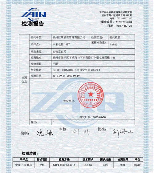 基于莱恩创科在空气治理领域的技术优势,红璞公寓与其建立了长效合作机制。其中以红璞公寓杭州中豪七格项目为例,在该项目空气治理中,莱恩创科以专业化程序分别对布艺、木艺、瓷砖、墙面、玻璃五种装修材质进行了喷枪、试剂治理。经过莱恩创科治理施工,项目16 楼所有检测房间较治理之前,各项污染物数值均大幅下降,其中甲醛检测数值平均降幅高达 95%,TVOC 平均降幅高达77%,且获得了权威机构浙江省浙江省检测检疫机构的合格认证。
