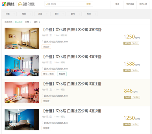 快捷找房、房源保障:一方面,魔飞公寓聘用专业的摄影团队,保证房源照片清晰真实,并经58客服团队对房源信息的严格审核,为租房群体提供最真实有效的房源诚信保障;另一方面,租客群体可在“58品牌公寓馆”内按照交通、户型、面积、价位等条件筛选心仪房源并线上预约看房,为租房群体节省大量繁琐的找房时间。