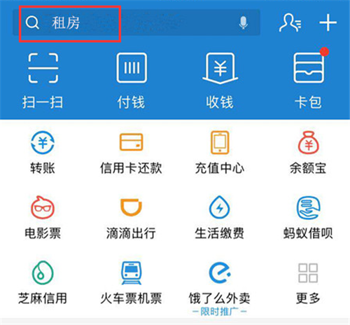 一、打开支付宝,点击上方搜索框搜索“租房”