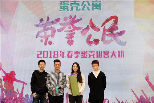 蛋壳公寓创始人兼CEO高靖还在现场与蒋璐霞为选拔出来的特别租客颁发了“荣誉公民”奖,此次选拔活动为期一个月,前期通过线上征集,发掘了大量的真实租客故事,有为了自己的梦想离乡打拼的斗志,也有因蛋壳公寓合租而结缘的暖心情侣,还有因为租住了蛋壳公寓省心舒心而更能够专注聚焦的创业者,共同的一点就是,这些年轻人都热情积极,坚持不懈,并自觉倡导和践行着一种积极健康的生活方式,如践行低碳环保的生活,维护小区环境等,这和蛋壳公寓的品牌内涵与价值观深深契合。