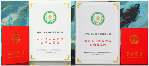 2018年4月26日,中国改革开放40周年和海南建省办经济特区30周年海南省酒店与餐饮行业影响力单位、人物颁奖典礼在海南省海口市盛大召开。本次盛会以“新时代、新海南、新机遇”为主题,涵盖主题演讲、高峰对话、2017年海南酒店与餐饮行发展报告发布、战略合作、交流互动等新颖而丰富的多项活动。其中,恒大酒店集团旗下的恒大海口湾度假公寓,荣获“海南酒店式公寓影响力品牌”与“海南亲子度假酒店影响力品牌”两项大奖!