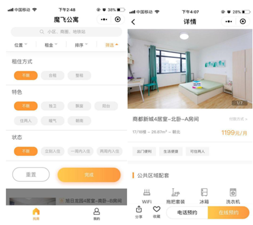 魔飞公寓借助微信小程序实现线上和线下的对接创造了一种新的模式,其在功能和操作上更加便捷。用户可在首页根据租金、位置、户型、入住时间等需求筛选理想房源,在搜索房源的同时也可收藏房源,分享房源,进行房源对比,最终至页面尾部电话预约理想房源,或选择在线预约,致电魔飞公寓管家。