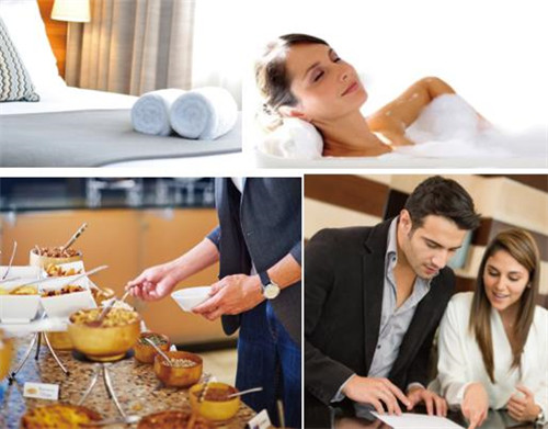 优质床品 COMFORTABLE BED;舒适洗浴 RELAXING BATH;营养早餐 NUTRITIOUS BREAKFAST;便捷商务 CONVENIENT BUSINESS