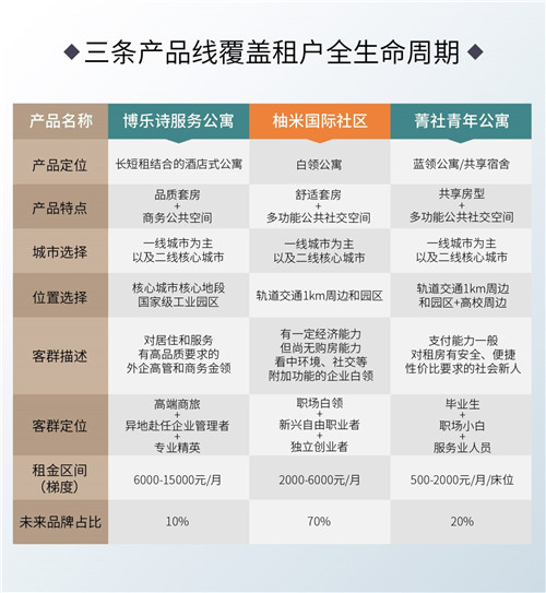 领寓实验室呈现了旭辉领寓目前成熟的三条产品线:城市新青年品质租房优选——柚米国际社区,企业商旅甄选服务式公寓——博乐诗服务公寓,学生、蓝领的第一次租房的高性价比选择——菁社青年公寓。通过提供差异化的产品,旭辉领寓的产品力图覆盖住户全生命周期,满足不同的阶段的租住需求,也通过不同的配比来优化租赁市场的供给结构。
