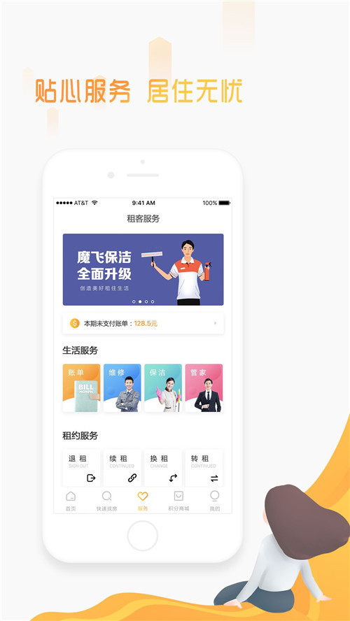 新版APP功能结构继续升级,魔飞公寓一直注重为用户带来便捷、贴心、全面的服务体系。在6.0APP版本中,服务页面重新设计优化,分为生活服务、租约服务、智能设备、咨询投诉、合作福利五大板块,各个板块服务内容一目了然,单一服务结构走向多结构服务同时发展。不论是新用户用户的签约、换组,或是在租过程中的维修保洁,WiFi、电表,都能随时随地查看、保修、解决。