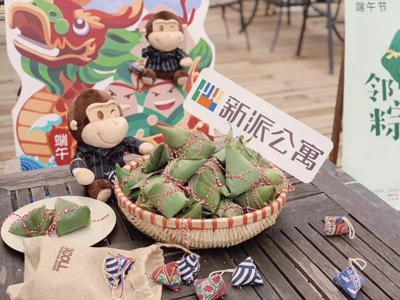 活动现场,新派公寓准备了艾草香囊、INS网红照相墙、白胖的糯米和清香的粽叶,以及带上了香囊可可爱爱、全新亮相的新派公寓吉祥物——一个叫派派的猩猩。