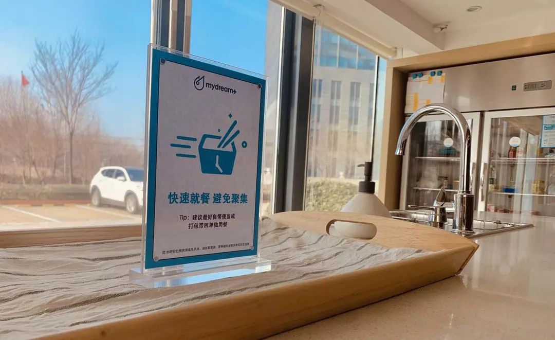 保持距离,避免聚集用餐。部分空间将在通风良好,且较为明旷的位置划分用餐区域,同时我们也提倡在各自办公位上就餐,做到食不言,不分享;空间内便利货柜上线泡面、面包等主食食品,以供大家在不方便取外卖或不放心外卖餐食的时候选用。