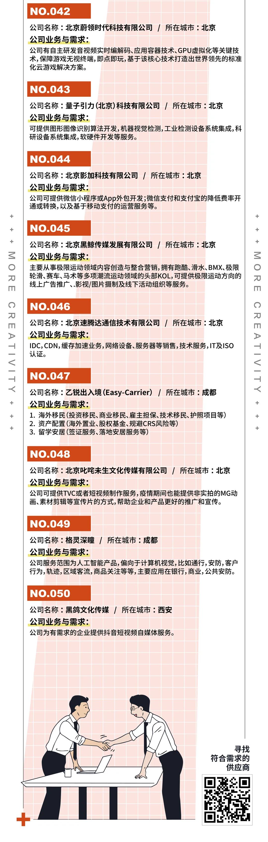 您若对以下公司提供的业务有需要,可将该公司对应的编号记下,长按“寻找符合需求的供应商”二维码,对应填写您的意向。确认信息后,我们将主动与您取得联系,为彼此建立沟通交流渠道。
