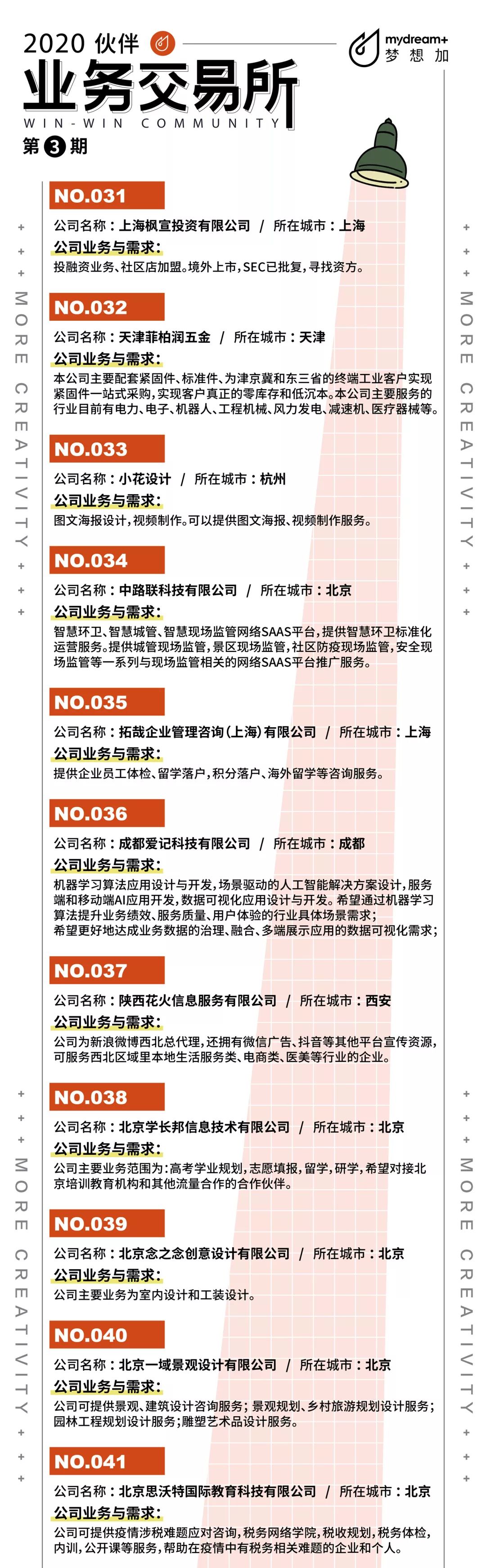 「业务交易所」目前已累计发送三期,共发布50个梦想加企业居民的业务信息。所有信息将陆续在梦想加全国3000+块线下屏幕和线上渠道传播,为企业做品牌曝光。(此活动梦想加仅作为“业务需求”代发平台,无法对企业业务信息做一一甄别,请大家在填写提供的业务服务时,务必保证真实有效;在寻找合作伙伴时,也请多加鉴别。)