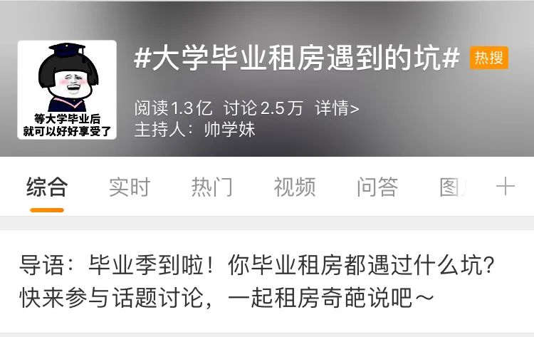 在#大学毕业租房遇到的坑#这个话题之下,目前已引发了1.3亿阅读,2.5万讨论。这些人当中有不少是已经有了几年租房经验的租客,还有一些即将要踏入社会开始租房生活的毕业生,以及一小部分的房东和长租公寓品牌方。