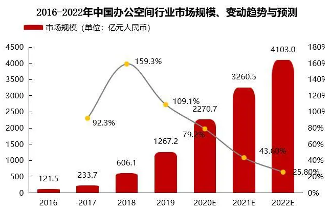 2020年,是我国办公空间品牌化的第5年。始于2015年,孵化器和联合办公代业态。前者,多依托政策,而后者则较多依靠资本,此时的联合办公全国仅有约50家品牌。2016年随着WeWork等国外头部品牌开始进入中国,以优客工场为代表的国内品牌快速成长,至2019年底,国内运营的联合办公品牌数超过2300家,3年内增长了46倍,行业市值也从120亿元人民币激增至1260亿元人民币,根据行业趋势推测,至2022年我国办公空间市值将以每年1000亿元人民币的规模增进。