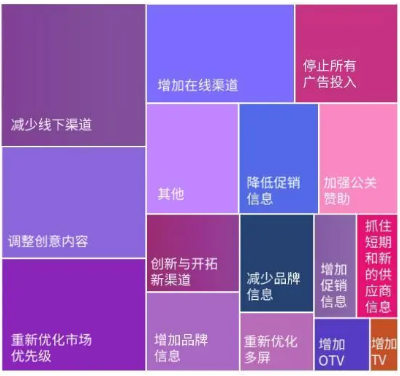 疫情后期,不少品牌削减甚至停止了所有广告投入(下图所示,疫情后品牌经营策略变化情况)。根据电通安吉斯5月报告中的观点,“短暂的广告费用取消可能是得不偿失的。理由是,错过品牌宣传的最好‘窗口期‘,而让品牌自身的‘恢复期’变的更漫长。”