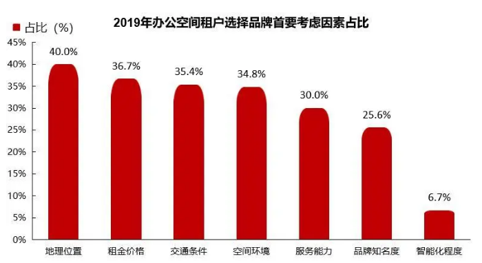 办公空间呢?联合办公从亮相之初,不少品牌都很中意“一价全包”这句广告语。简洁明了的告诉租户,包含工位租金、茶水间、物业费。是实惠,也是租赁市场的“平权”,租金的实惠对于初创企业和中小企业更有吸引力。加上,灵活的租期与起租面积、“拎包入驻”免去装修的后顾之忧。另一方面,联合办公地理位置大多在CBD与TOD(地铁上盖等)的甲级写字楼,配套有接待区、会议室、现煮咖啡等。入驻企业的老板、员工、与来访的客户都会觉得有面子还有里子。这是对企业住户的尊重,更是回归服务本质的体现。地理位置、租金价格和交通条件是用户在2019年最关心的因素,而这些因素在项目开业之后都是无法改变的,未来,随着城市更新而优化的城市交通与TOD的日益成熟,上述3个外因或将不断“拉平”。环境、服务和品牌势可能后来居上,成为用户租赁的决策因素与品牌的竞争的“护城河”。