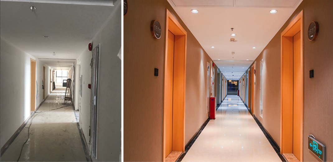廊道墙面加贴浅灰墙布,改变原白墙对灯光的反射效果,在通过简单的改造灯光氛围,筒灯结合射灯方式,营造廊道温馨、精致的氛围。因此,窝趣在灯具供应商的选择上均会考虑有产品深化能力的团队。