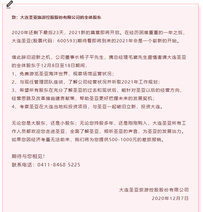 12月7日晚,大连圣亚官方微信账号发布了一条“大连圣亚邀请全体股东免费游圣亚”的公开信。公司董事长杨子平先生,携总经理毛崴先生盛情邀请大连圣亚的全体股东于12月8日至18日期间,免费游览圣亚海洋世界,视察场馆运营状况;与现任管理团队座谈,了解公司经营状况并听取2021年工作规划。并希望所有股东在充分了解圣亚的过去和现状后,针对圣亚以后的经营方向、经营思路及改革措施建言献策,帮助圣亚更好把握未来的发展契机。信中还提到,无论是大股东,还是小股东;无论是持股多年,还是刚刚购入,大连圣亚都欢迎来访。如果因经济考量无法前来,大连圣亚将提供500-1000元的差旅报销。