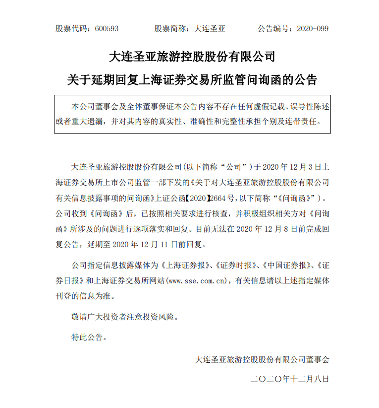 12月8日,大连圣亚未能如期回复上述问询函,发布了关于延期回复上海证券交易所监管问询函的公告。公告显示,公司收到《问询函》后,已按照相关要求进行核查,并积极组织相关方对《问询函》所涉及的问题进行逐项落实和回复。目前无法在2020年12月8日前完成回复公告,延期至2020年12月11日前回复。