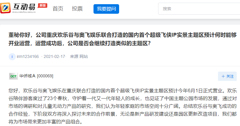 2月24日,据深交所互动易获悉,华侨城A在平台表示,欢乐谷与奥飞娱乐在重庆联合打造的国内首个超级飞侠IP实景主题区预计今年6月1日正式营业。华侨城A表示,总结欢乐谷与奥飞成功的合作经验,下阶段双方将深入探讨未来的合作前景,无论是新产品研发建设还是园区更新改造项目,我们都将为市场带来更加丰富的产品组合。