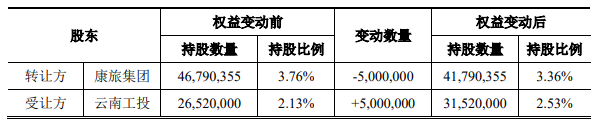 据公告显示,本次标的股份协议转让单价为 100 元/股,全部 5,000,000 股股份的转让总价款为 5 亿元,由云南工投在本协议生效之日起五个工作日内支付。本次权益变动前,康旅集团持有公司股份 46,790,355 股,占公司股份总数的 3.76%,云南工投持有公司股份 26,520,000 股,占公司股份总数的 2.13%。本次权益变动后,康旅集团持有公司股份 41,790,355 股,占公司股份总数的3.36%,云南工投持有公司股份 31,520,000 股,占公司股份总数的 2.53%。