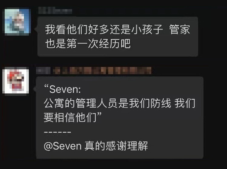 住户中有需求,他们第一时间响应解决;住户中有误解,他们默默承受努力消化。在周边小区逐渐暴露物资短缺危机时,他们持续联系和组织社会各界力量,竭尽全力解决住客的饮食起居需求。