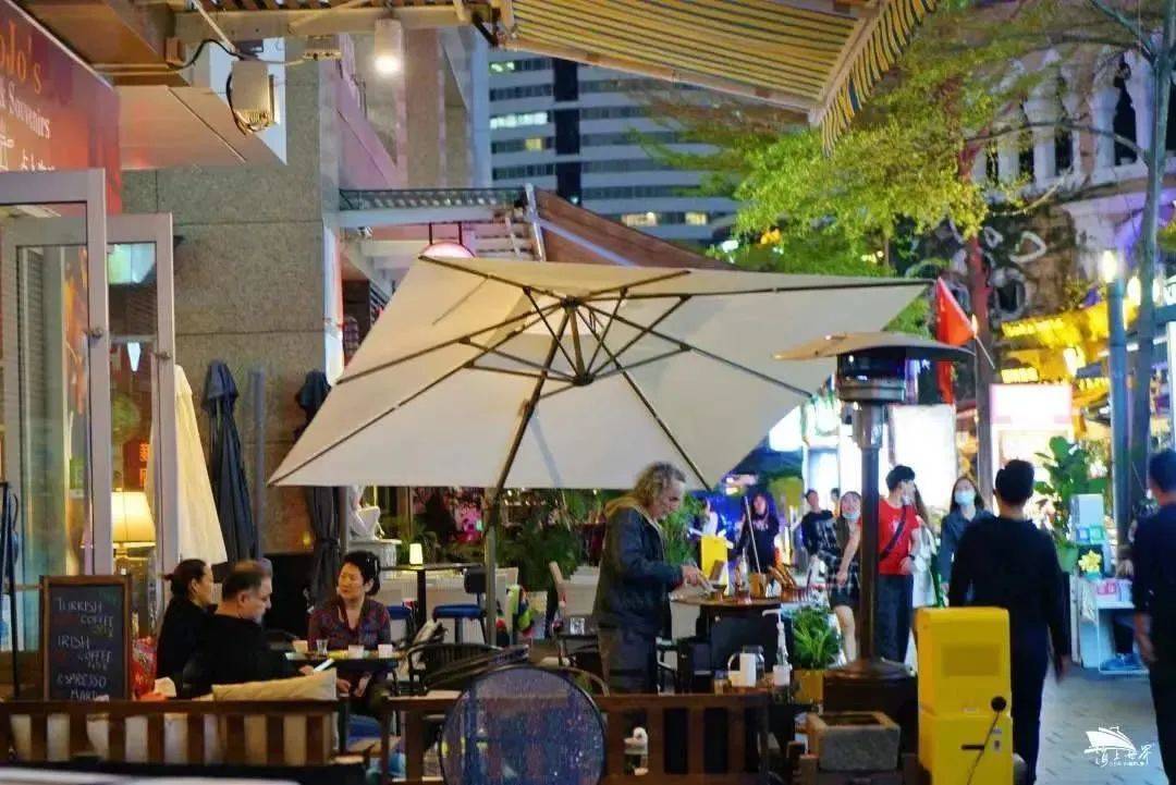 夜晚,沿街的小酒吧都热闹起来,阳伞下、倚栏边、树下石凳上,融入朝气蓬勃的年轻人群中,一起谈笑风生、自在随意。