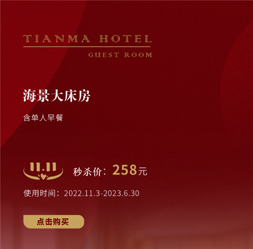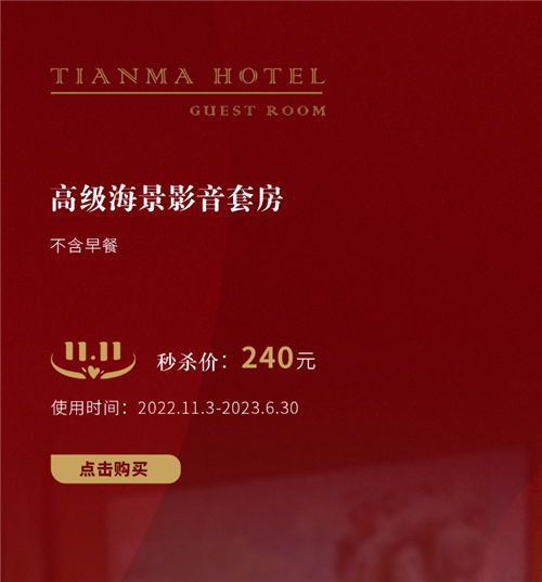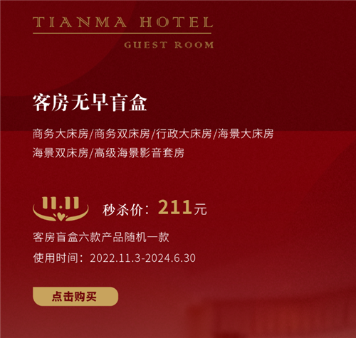 山东烟台天马雅阁公寓(雅阁酒店集团旗下成员酒店)推出双11丰富盲盒套餐等你来享:客房无早盲盒、海景大床房、高级海景影音套房、双人套餐、更有各种优惠储值卡多重客房入住礼遇。
