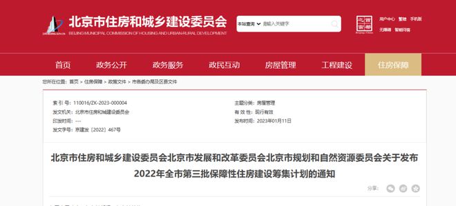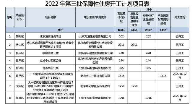 根据北京市住建委官网对外发布2022年全市第三批保障性住房建设筹集计划的通知,计划开工共涉及8个项目、房源8083套,均为保障性租赁住房项目,包括2个集体经营性建设用地建设项目、房源4161套,5个非居住存量房屋改建项目、房源2507套,1个产业园区配套用地建设项目、房源1415套。