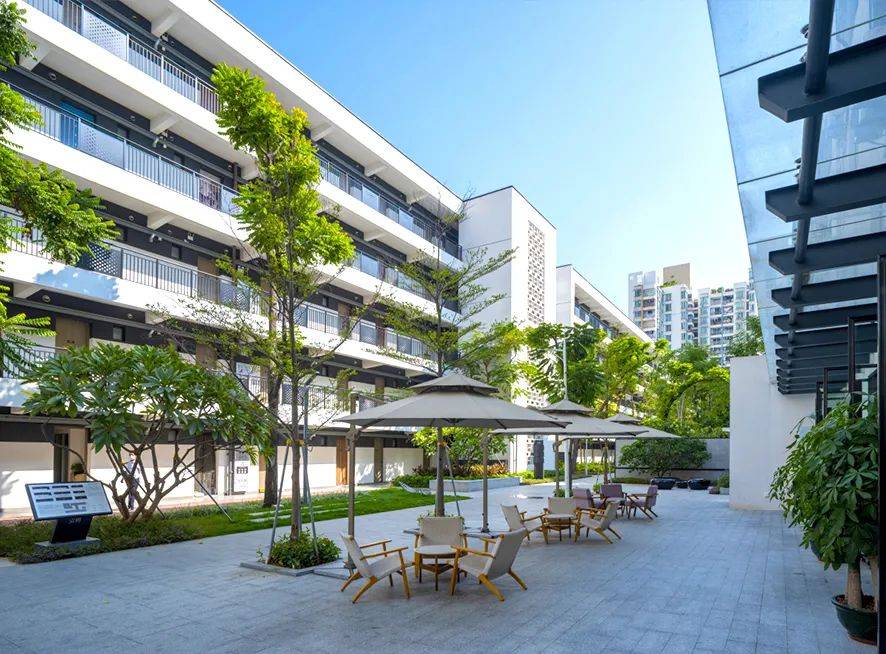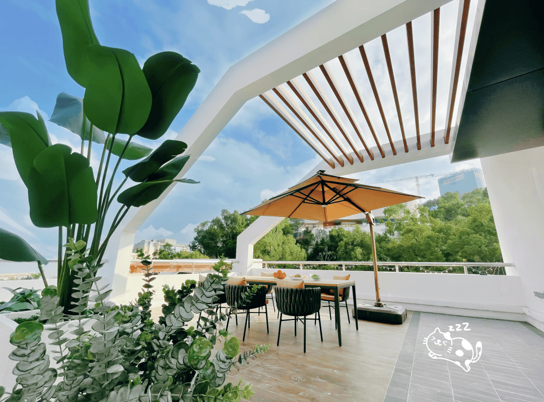 绿树蓝天白墙,太阳伞、休闲椅