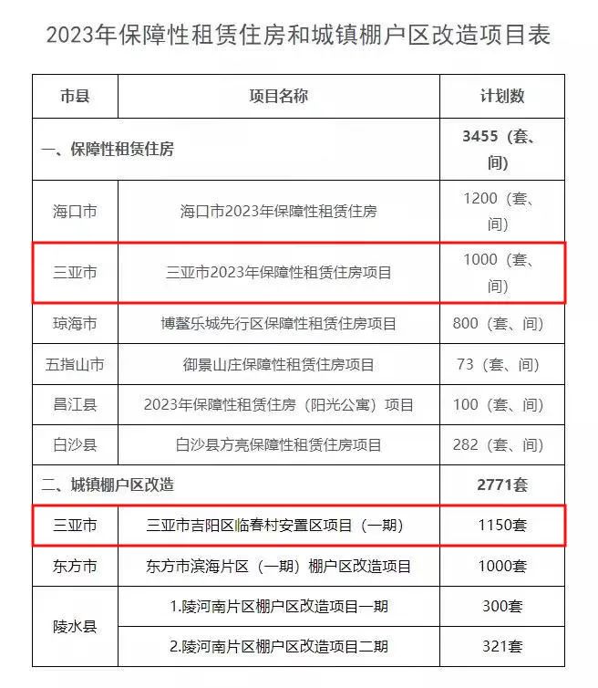 近日,海南省住房和城乡建设厅、海南省发展和改革委员会、海南省财政厅三部门联合发布《关于下达2023年保障性租赁住房、公租房保障和城镇棚户区改造计划的通知》。2023年全省计划筹集保障性租赁住房3455套(间),发放住房租赁补贴11149户,开工城镇棚户区改造住房2771套。其中,三亚计划新筹集保障性租赁住房1000套(间),发放公租房租赁补贴543户,开工城镇棚户区改造住房1150套。
