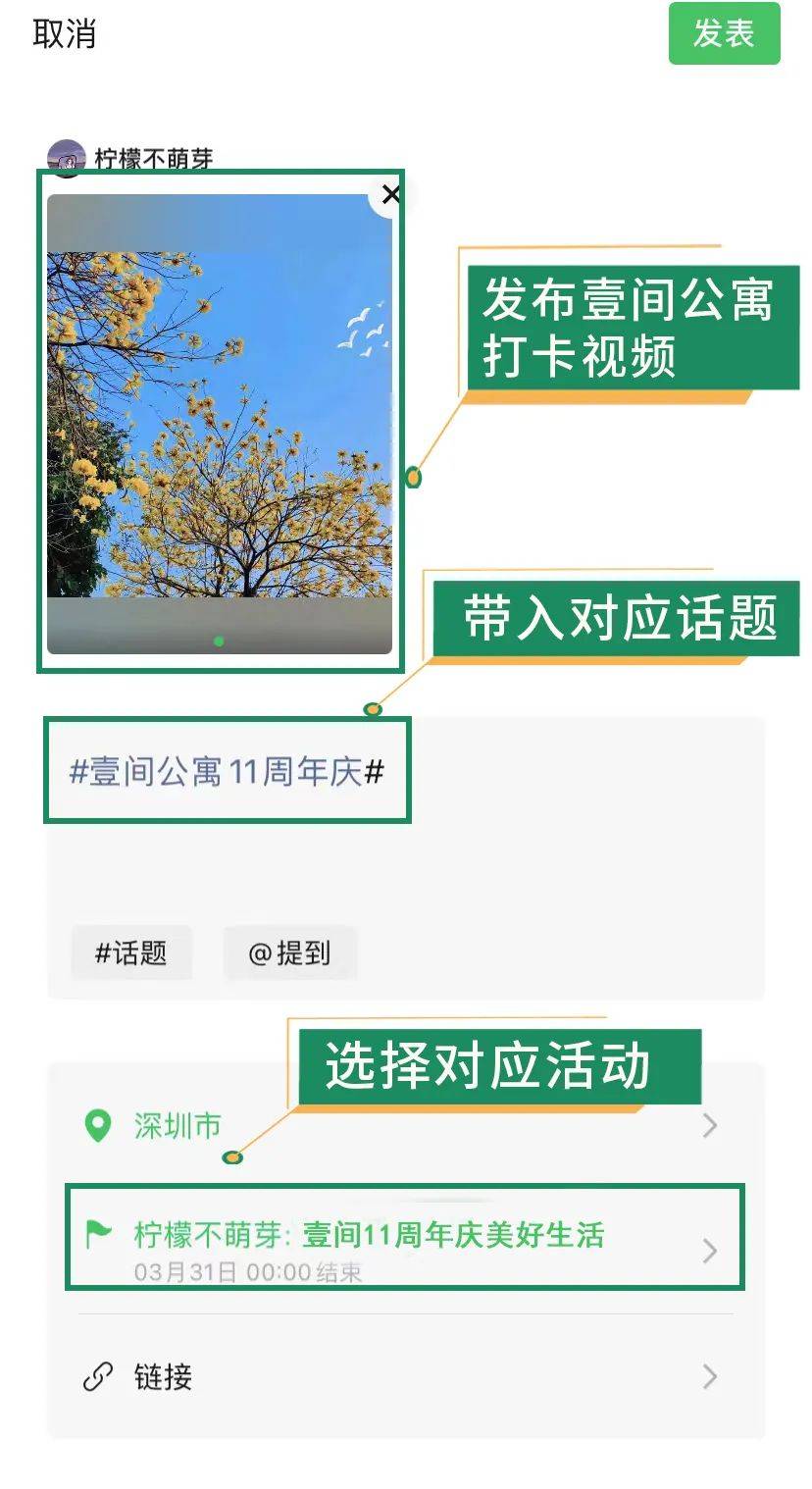 点开微信视频号→点击发表视频→上传已拍摄的【壹间公寓打卡】视频→带入话题#壹间公寓11周年庆#→选择对应活动【壹间11周年庆美好生活】→发布