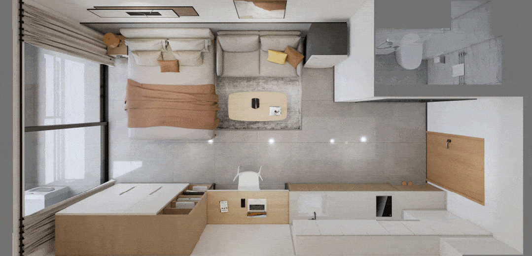32㎡精致单房,简约时尚,是一人居的惬意。入户的壁柜收纳鞋包,将工作的忙碌也一起收纳。往前一侧是浴室,另一侧则是开放式厨房,洗去疲惫后给自己做一杯简单茶饮,享受自我的时光。中间的休闲娱乐区是自我的天地,窝在沙发娱乐生活,或去书桌充实自己,齐全的家私和家电,是生活舒适的底气。