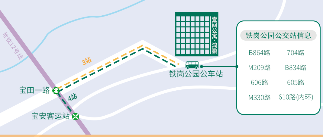 为实现便捷出行,壹间公寓·鸿鹏以迅捷交通网络,助力逐梦人生活提速。近享地铁12号线宝田一路、宝安客运站地铁站,楼下即有铁岗公园公交站地铁接驳巴士,线路四通八达可到深圳各区域;多元化交通路网,让你上班不迟到不是梦,出行方便又快捷~