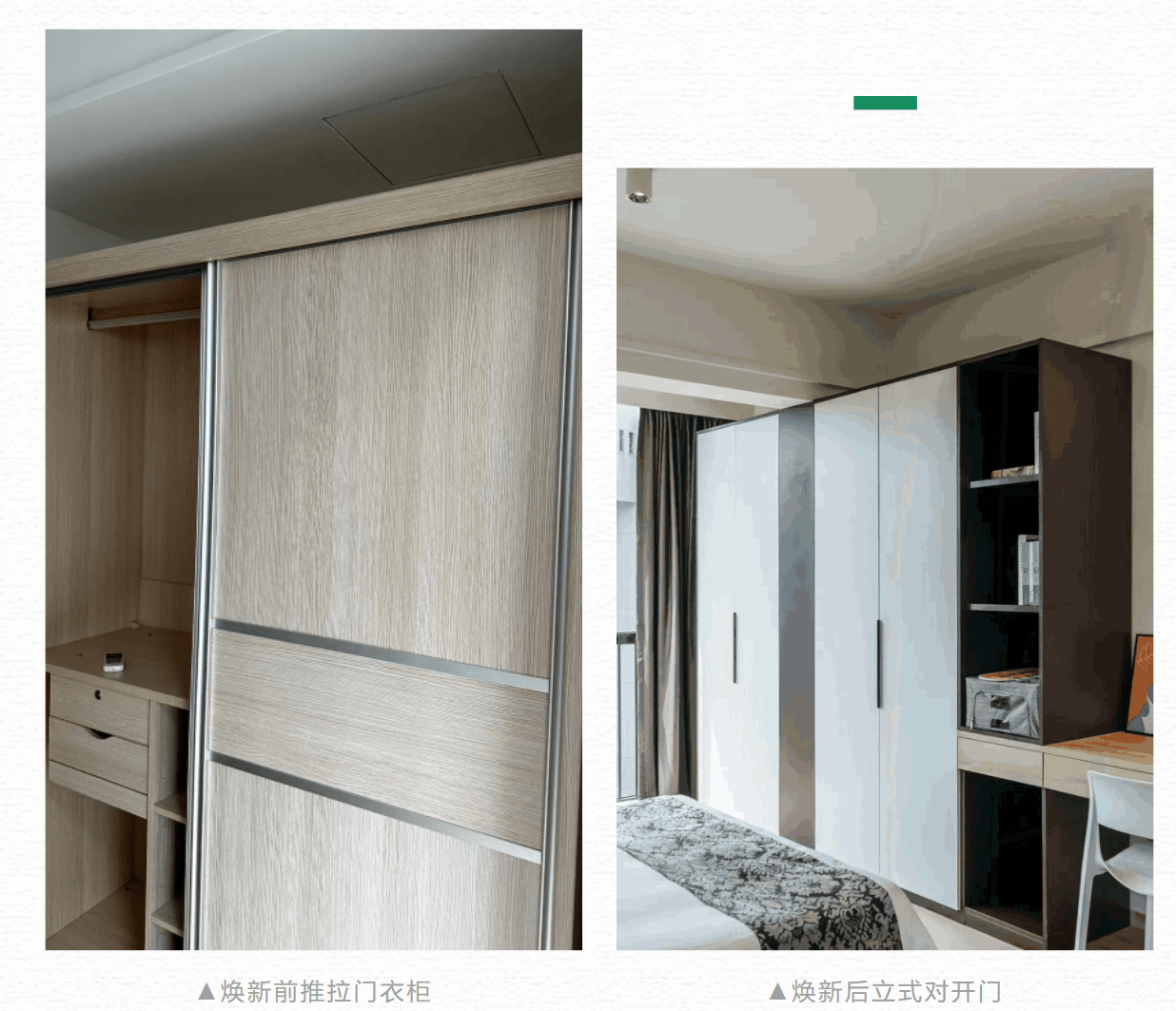 房间焕新了全套家私:衣柜从推拉门焕新为立式对开门,内部精细化分区,分为「长挂衣区」和「层板收纳区」,可任意挂、叠衣物,选择更多;顶层隔出大空间,可收纳换季的衣物被褥,充分合理利用。