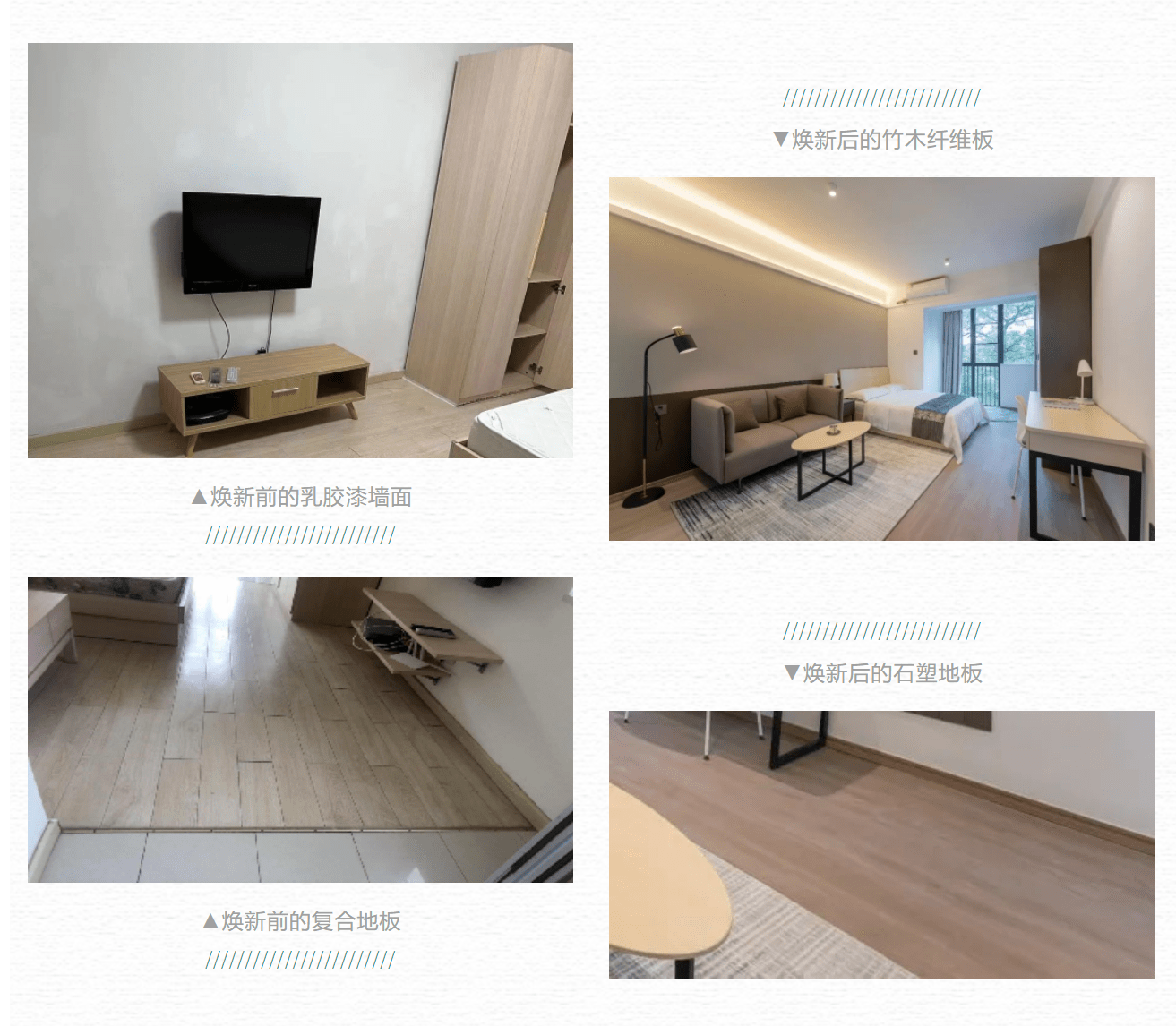 壹间公寓·槟榔园此次焕新升级,在家私用材上暗藏惊喜:新采用的竹木纤维板具有更耐用、更环保健康、易清洁的特点,予人以更好的居住体验。