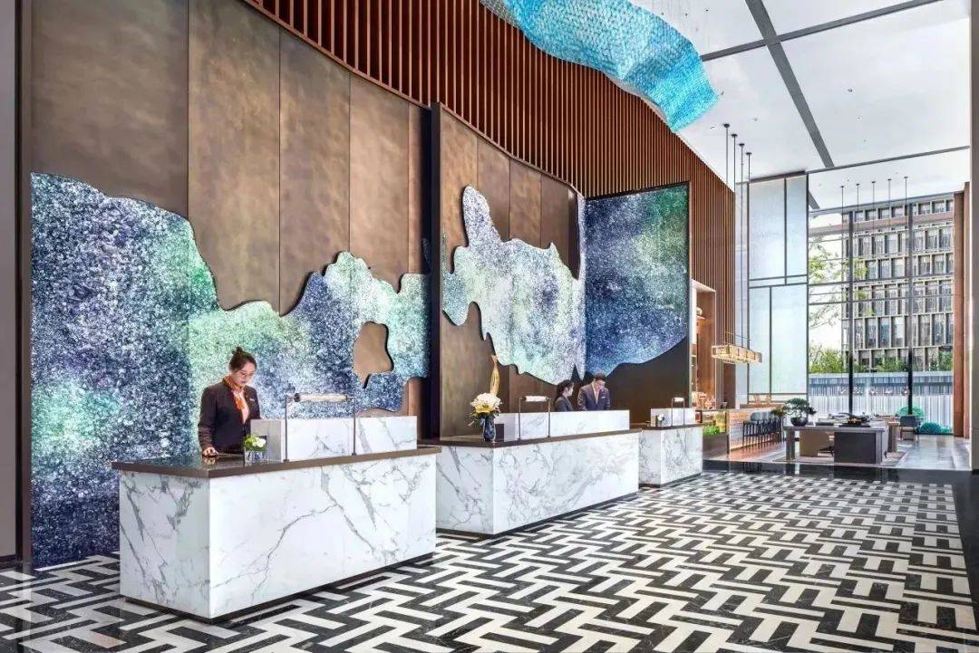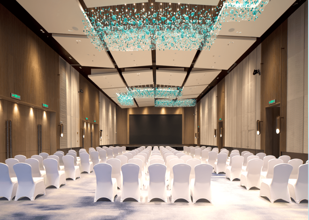 酒店拥有超1,000m²的宴会及会议空间,其中包含一间770m²,挑高8m的无柱式大宴会厅,以及4个会议室。整体设计以树林山河为灵感,利用绿色绸带及饰面材料体现出树林的层层叠叠,水波纹镜面呈现出时尚的质感及光影流淌幻觉,以用水晶灯装置形成山峦起伏,虚实结合体现整体空间的美感及艺术效果。
