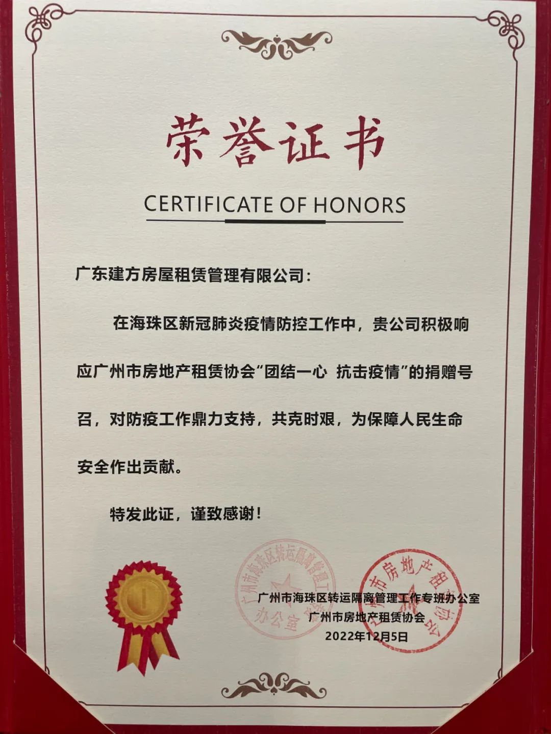 紧接着为了表彰参与2022年11月26日勇敢捍卫海珠区防疫安全的个人以及优秀企业,协会会长刘昕对参加“团结一心 抗击疫情-抗疫公益爱心活动”慷慨逆行的志愿者单位颁发荣誉证书。建方长租作为致力于为租客打造美好舒适租住生活的长租公寓品牌,一直秉承“创业乐安居,租者有其屋;长租即长住,长住即安家”的核心价值观,勇于承担社会责任并服务社会的时代精神,在抗疫行动中全心全力地贡献一份力量。